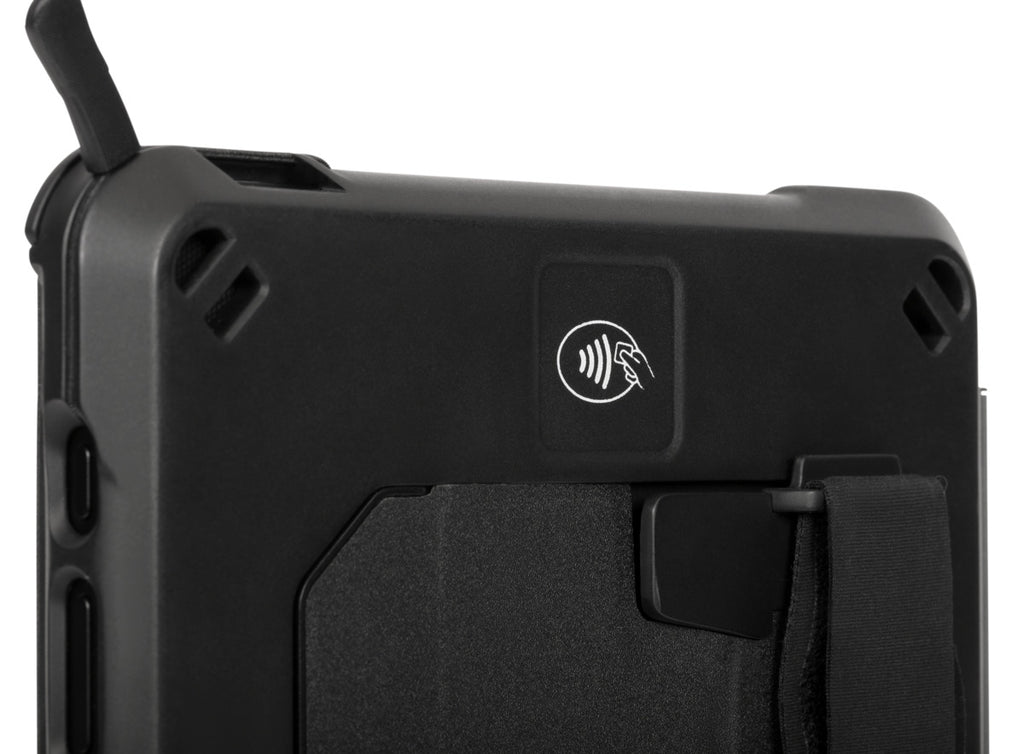 Protective in design, the field-ready case also delivers ultimate functionality. Its detachable hand strap provides a secure hold, while its integrated sliding handle doubles as a stand that enables two hands-free typing or viewing angles. It even sports a card holder for a convenient way to position an ID or credit card when needing to input personal or payment details.